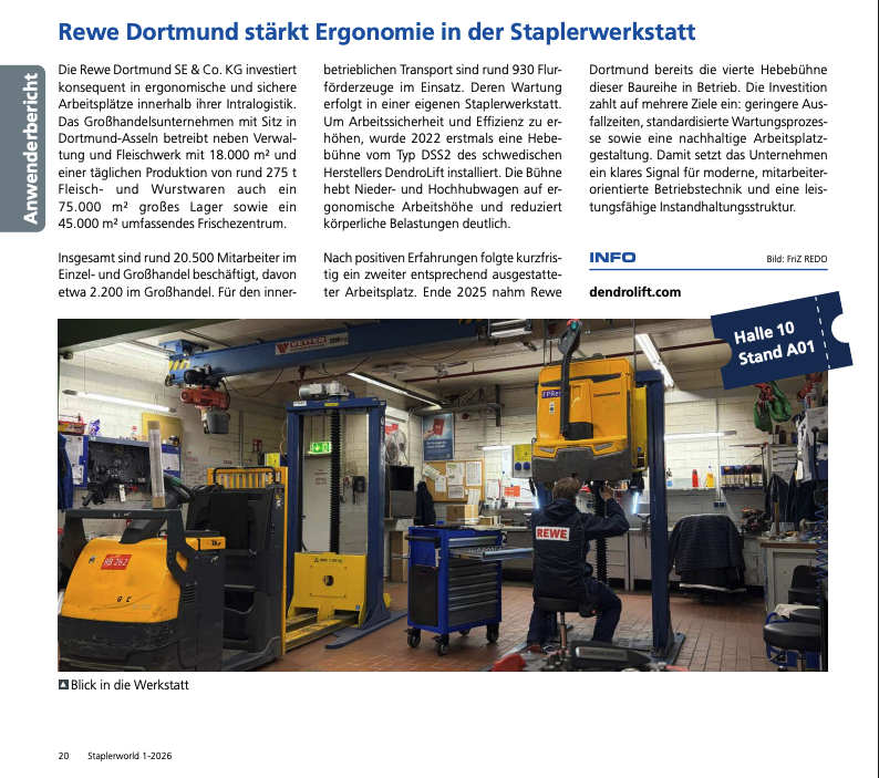 Die DSS2 Staplerwerkstatt Lösung von Dendro Lift wurde bei Rewe Dortmund eingeführt, um die Anforderungen an Effizienz, Ergonomie und Sicherheit zu erfüllen.